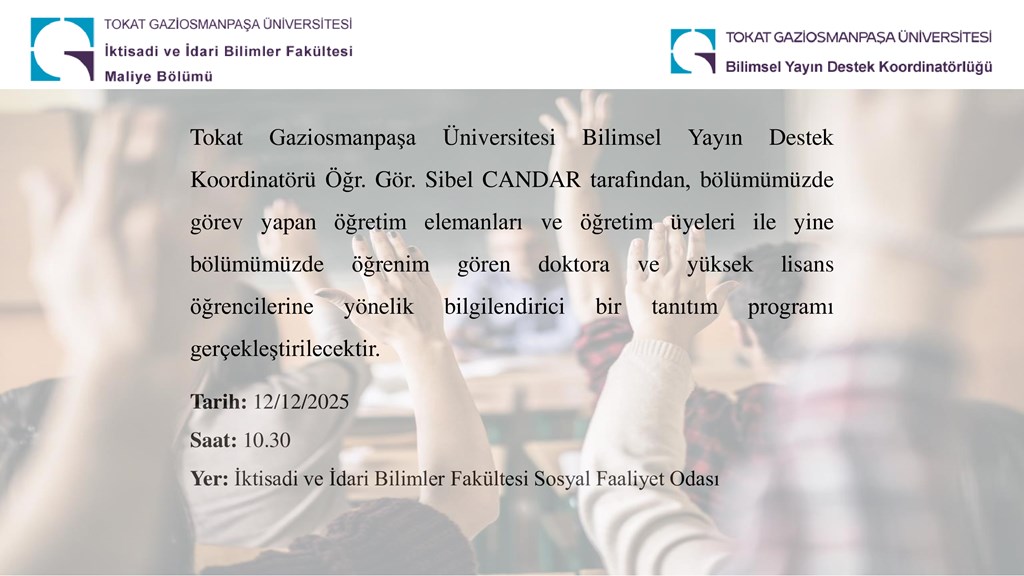 . Gör. Sibel CANDAR tarafından, bölümümüzde görev yapan öğretim elemanları ve öğretim üyeleri ile yine bölümümüzde öğrenim gören doktora ve yüksek lisans öğrencilerine yönelik bilgilendirici bir tanıtım programı gerçekleştirilecektir.